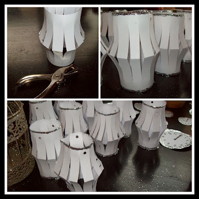 The next craft I made were little paper lanterns. I have been making paper lanterns since I was a child in school, I have made them many times over the years with different colored papers for all the different holidays. This past week I was watching a British Mystery on PBS and they kept showing little paper lanterns that some children were crafting, and so I was inspired to make some for New Year's Eve. I knew right away I wanted to make them to match my clocks with plain white copy paper, and of course some more silver glitter! They are super easy to make, here is a quick tutorial.