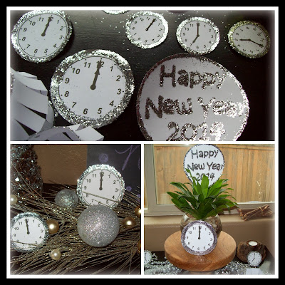 I tucked the little glittered clocks throughout my dining room decor. I kept out some of the glittery floral picks from Christmas, and some of the silver glittered Christmas balls to use as New Year's Eve decor. I love the way they turned out! If I had more time I would love to make some glittered clocks with a aged newsprint background, and maybe some different paper fringes, but I will have to save that for next year!