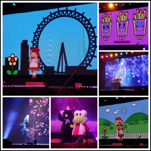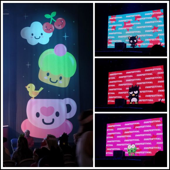 They had a couple stage areas for live shows, a smaller one, and then a large one with a big screen, lives shows happened like every twenty minutes to half an hour or so. You could walk around and attend whichever show s you wanted as well as do all the different activities. One of the stations was a little movie theater behind this giant box of popcorn, I was excited because I had heard there might be a video of some of Sanrio's newer characters.