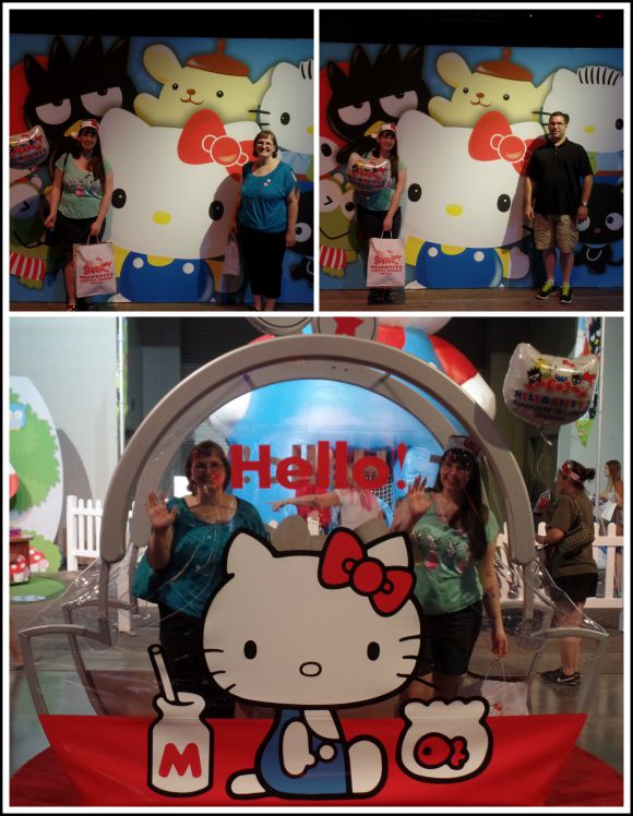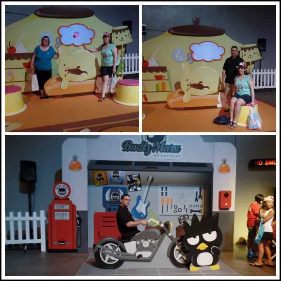 There were multiple little areas decorated for each of the main Hello Kitty characters. They were set up so you could take pictures, which I thought was really fun. Here we are in Pom Pom Purin's living room, as well as Badtz Maru's Motorcycle Shop. We enjoyed walking around all the different stations and getting pictures.