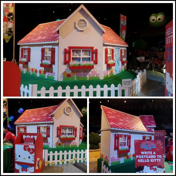 There was a miniature Hello Kitty House, on one side of it there was a station to write a postcard to Hello Kitty, along with a mailbox to mail your letter, as a reward you would get a cute button. :) There was also a paper folding station where you could make an origami bow or a fortune teller cootie catcher type folded paper.