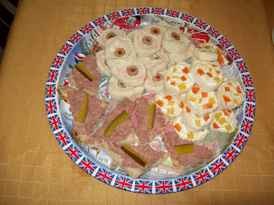 Break up a can of corned beef with a fork, and mix in a couple tablespoons of mayo, and a Tablespoon of Creamy Horseradish Sauce, until combined and somewhat spreadable but not at all too soft. You may need to add more mayo and horseradish sauce to taste. Set mixture aside. Cut off the crusts of whole wheat bread, and toast in a toaster oven, or on a baking tray in oven. Cut toasts on the diagonal. Spread a layer of corned beef mixture on toast, and top with a sliver of bread and butter pickle. You can see a picture of this tea sandwich on the round plate.