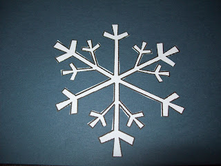 So, I went online and searched for some winter stencil images, and settled on an angel and a snowflake. I printed them out, then gathered my supplies- Black and Dark Blue cardstock, glue sticks, scissors, craft knife, and cutting mat. First I carefully cut out my snowflake. Then, carefully using a glue stick, glued it down to my blue cardstock, like this.