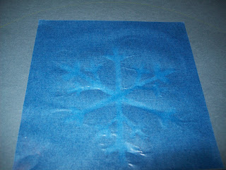 So, I went online and searched for some winter stencil images, and settled on an angel and a snowflake. I printed them out, then gathered my supplies- Black and Dark Blue cardstock, glue sticks, scissors, craft knife, and cutting mat. First I carefully cut out my snowflake. Then, carefully using a glue stick, glued it down to my blue cardstock, like this.