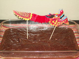 Every year on the Chinese New Year we have Chinese Food for dinner, some years we have take away, and other years we make something. This year we are having Orange Chicken and Rice with veggies. We also have a silly tradition that started the very first year we celebrated Chinese New Year. I had purchased some really fun Dragon Picks for our celebration, and wanted a dessert to put the dragon on. I couldn't really find a recipe that I could make up quickly, and since it was a busy day that year, I made a pan of brownies, and stuck the dragon pick in the brownies. We have celebrated with a pan of brownies, with a Dragon Pick, every year since. I bought the Dragon Picks in bulk from Oriental Trading Company and still have enough for a few more years. So even though they are in no way traditional, we still look forward to our Chinese New Year Brownies every year. :) Here's our dessert for tonight.