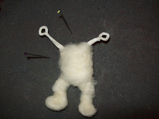 I decided to take a picture of the wool core wrapped around the pipe cleaner arms and legs. I decided, after promptly breaking a needle, that I am not fond of needle felting over a wire frame, you have to be much more careful while needle felting to not hit the wire.