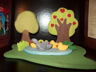 And the white swan in the picture above, also out of wool felt. I had fun setting the different scenes for this story using my little Ostheimer ducklings, and other wooden pieces.