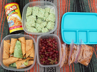 We packed a simple picnic for lunch, some yummy wraps, grapes (which I just love snacking on), some classic Pik-Nik shoestring potatoes, and some "green" rice krispy treats, and pretzels. I bought the turquoise reusable trays a few years back, and they are great for picnicking, they reminded me of the old lunch trays we had back when I was in grade school, easy to bring with and nice that they are reusable.