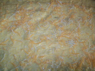 Spread into a 9x13 baking pan, and top with a thin layer of shredded cheese (cheddar, cheddar/jack, or Mexican blend cheese will all work) about 1/2 cup maybe 3/4 cup.