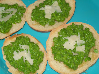 Brush on a little clarified butter to the toasted baguette slices, then top with pea mixture, then add flakes of Parmesan. Serve right away while the pea mixture is still retaining some warmth.