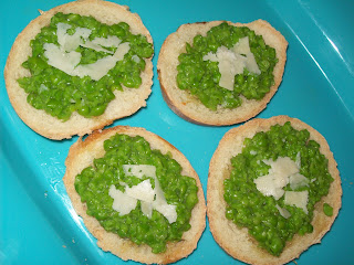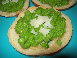 I had been thinking for awhile about a Green Pea topping for crostini, and researched quite a few recipes, most called for olive oil, and garlic and such, but I really wanted to just taste fresh peas, so I came up with a very simple recipe, and it turned out delicious.