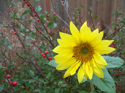 What a nice surprise, I haven't planted sunflowers for quite some time, and I have been missing them. I usually feed the birds a waste free seed, with chopped sunflower, but once or twice this summer we used a seed mix with whole sunflower seeds, and it looks like a few have sprouted up. I love the happy yellow color against the browns of the plants that are starting to die back.