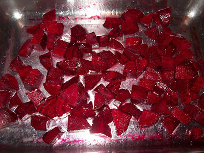 With all this cooler weather, I have been busy in the kitchen. Last week I bought a nice little bunch of beets, and last night roasted them up. Most recipes on the web have you place an unpeeled beet in a foil pouch with olive oil to roast in the oven, and then peel it after it is done roasting. I wasn't sure how well that would work, and I wasn't sure I wanted to try peeling hot beets and then cutting them into chunks right at the time I would be finishing off the rest of dinner, so I opted to peel and cube them first. My what a magenta mess that was, my hands are still died purple and pink! Next time I need to pick up a box of kitchen gloves. :) But it was well worth it. They turned out delicious!