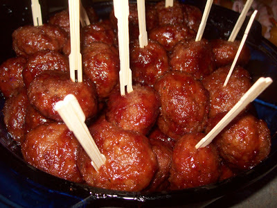 I made a batch of the classic sweet and sour meatballs, I baked two bags of frozen turkey meatballs, while they were baking I heated in a saucepan one jar of chili sauce and half of a large jar of grape jelly (probably around a cup or cup and a half of jelly), until the jelly and chili sauce were combined and let it come to a low boil, stirring constantly, then simmer, stirring frequently until meatballs were done baking, and sauce had thickened a bit. I transferred the meatballs to a large stainless steel mixing bowl, poured the sauce over the top, and gently tossed until they were coated. I transferred then to a large casserole dish, and kept them covered in a low oven until I was ready to serve them.