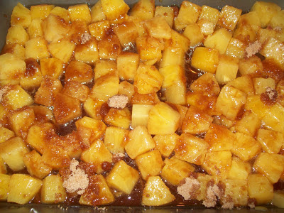 First I emptied three cans of drained pineapple chunks into a roasting pan that was drizzled with a little cooking oil. Then I sprinkled the pineapple with brown sugar, probably a little more than a cup, enough so all the pineapple had a little brown sugar topping.