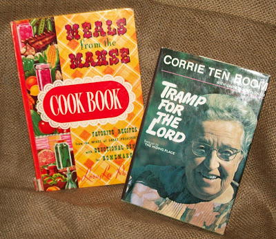 I found a Corrie Ten Boon book, I have always wanted to read one of her books, so it was fun to find a copy of one, Corrie Ten Boon's family helped hide persecuted Jews during World War 2, and as a result she ended up spending time in a concentration camp, when she was released she began traveling the world doing mission work and telling her story. I also found an interesting looking cookbook, from 1950 with recipes from preachers wives with devotionals for Homemakers- I love vintage recipe books as well as vintage Homemaker literature, so this mid-century book should be a fun one to browse through.