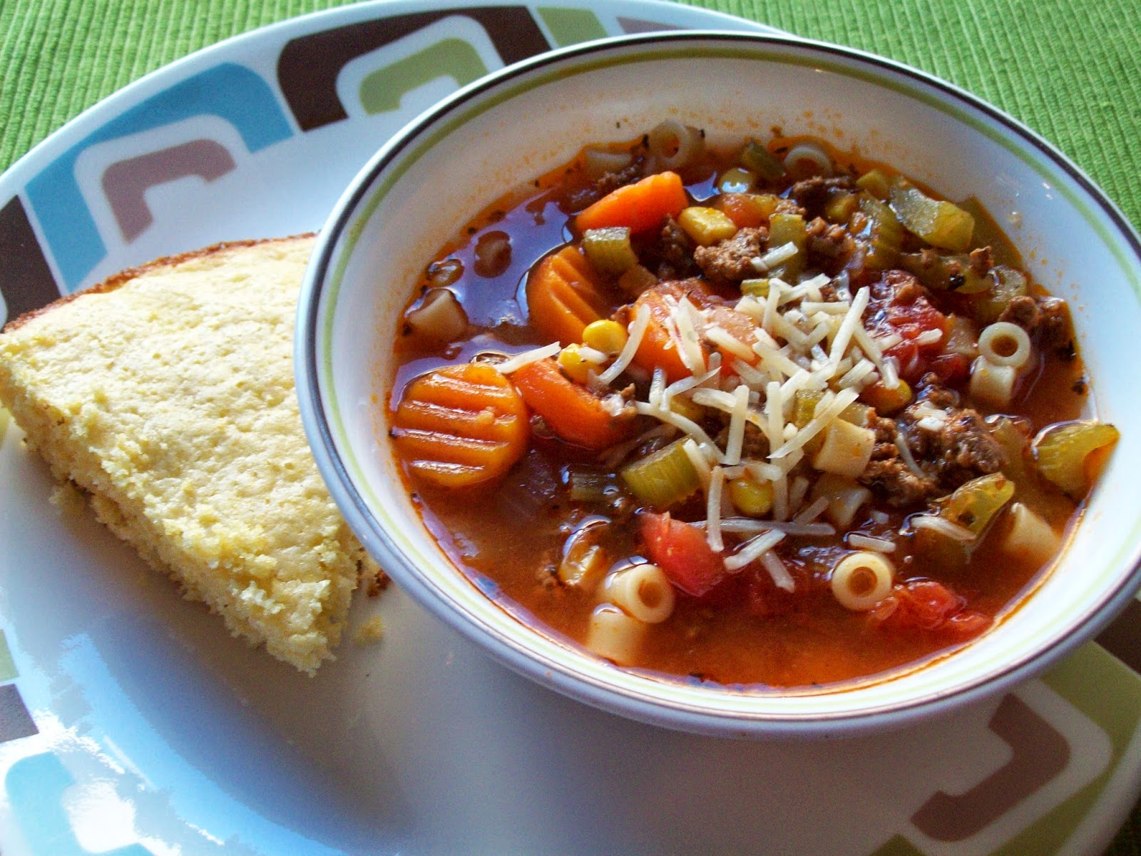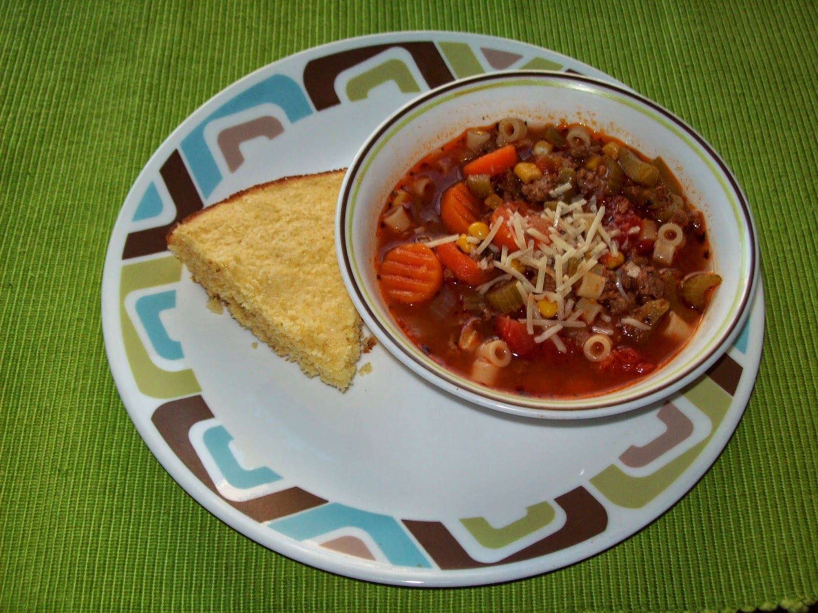 In a saute pan saute chopped onions and celery in a little olive oil until onions are starting to be translucent and celery begins to soften. Then in a large soup pan add cooked and drained hamburger, beef broth, sauteed onions and celery, both cans of diced tomatoes, 1 cup tomato sauce, frozen carrots, and a clove of garlic minced or pressed through garlic presser (you could add two cloves if you like a bit more garlic flavor), add salt and pepper to taste as well as a tablespoon of Italian Herb blend ( I use McCormick's Gourmet Italian Seasoning, if you don't have that you could add your own mix of basil, oregano, thyme, and rosemary). Add a couple cups of water to the soup as well and simmer on medium to low for a couple of hours, check often and stir, add more water if needed. After two hours, add in drained can of corn, more salt pepper and another teaspoon or two of Italian seasoning to taste. Continue cooking for another 45 minutes or so on a low simmer, cook until veggies are cooked through and softened, and broth has a nice flavor. You can cook longer if you want to on low until you are ready for dinner. Cook and drain your soup pasta, I always serve my soup pasta on the side and we add it to the bowl before ladling soup over pasta, that we we can all choose how much pasta we want, and the pasta doesn't get soggy.