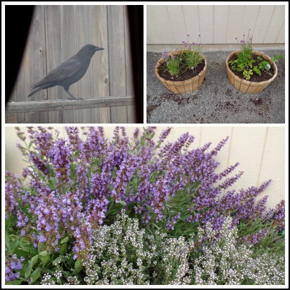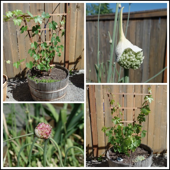 The grapes I planted this spring are doing nicely and growing very well, I don't expect any fruit this year, and hope I prune them correctly for next year, they are a bit of an experiment, but it will be fun to see if they do well in containers. My garlic is very nearly ready, the elephant garlic as well as the smaller variety are just about to bloom this week, I thought the elephant garlic flower with its little cap on looked a bit like an elf with a little pointy cap, I also love the pinkish color of my Killarney Red garlic flower.