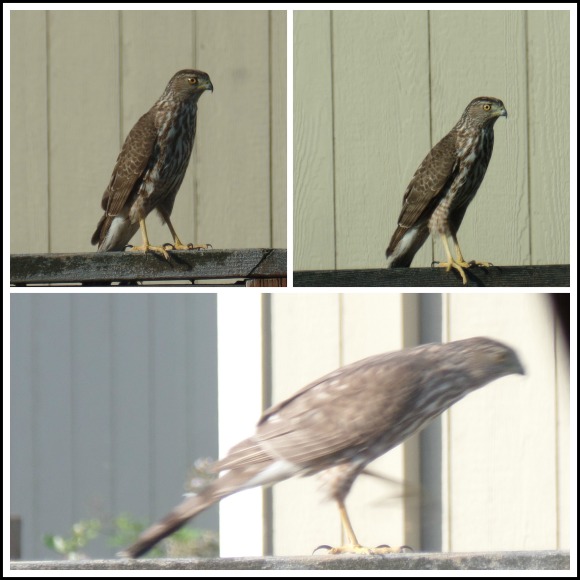 We also had a very interesting visitor to the garden this week. I had the curtains open during a girls Bible study I host, and just as we began our lesson this bird lands in the garden. I was sitting directly across from the window and was definitely surprised. I had to grab my camera and get some pictures, the bird stayed in the garden for at least ten minutes. I suspect it was hunting my small bird feeder birds, I most often have at least a dozen little birds hanging out at the feeders. They were all smart to scatter while we had this visitor.