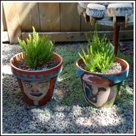 I also thought I'd show a picture of the wonderful flower pots the kids painted for me back in grade school. My kids are now young adults, I had these pots put away for safe keeping for the longest time, last year I sprayed them to make them weather proof, and I decided that this year I would enjoy them more if they were planted and in use in my garden. I put a little heather plant in each one, and I love the way they look. :)