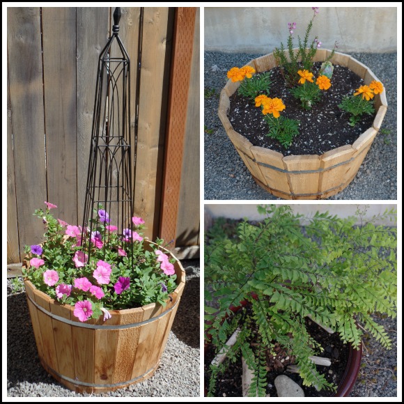 The petunias are starting to fill out their pot nicely, and the maidenhair fern is also doing well, I had extra marigolds and decided to plant them in a pot that had a little space left, I was going to plant them in my veggies, but something keeps eating all the leaves off of my Marigolds near my veggie patch, not sure if it is a bird or a bug, but I'd be curious to figure out who is nibbling them, I thought they were supposed to deter pests? Either way, these marigolds seem to have escaped being nibbled.