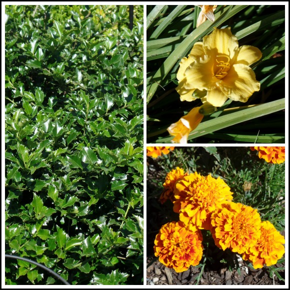 I had to take a picture of my holly bush, it has been having a rough couple of years, I transplanted it from a corner of the garden that was too hot for it, and it has spent the last couple of years recovering, right now the leaves look so vibrant and a rich glossy green, so I'm happy it seems to be making a comeback. I also love all of the yellows and oranges in the garden right now, the marigolds, day lilies and nasturtium are so pretty.