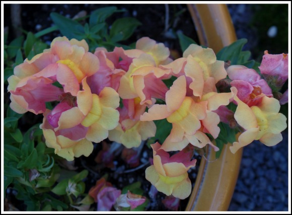 This month the garden is looking beautiful. Flowers are blooming all through the garden, and the colors are very pretty. Below is a picture of my favorite snapdragon, it blooms in pink, coral and yellow and shades in between. This plant grew from a volunteer that popped up last summer, and made it through the winter at which time I transplanted it to one of my flower pots, I love volunteer plants, they are always such a surprise.